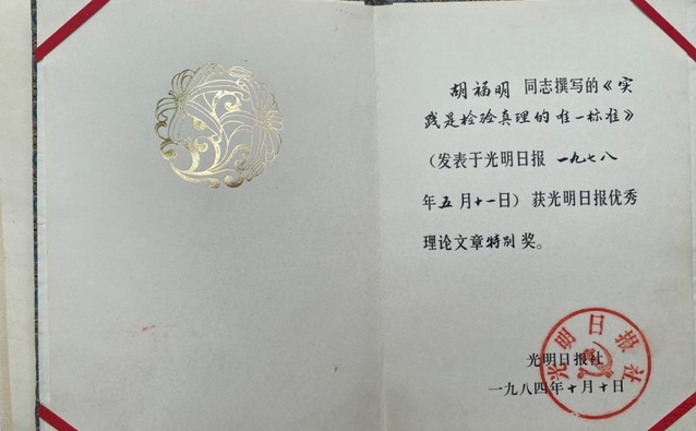 岁月驱使,年轮更替,胡爷爷的视力已大不如前,执笔写字的次数渐渐少了,但对于国情,他仍然有着敏锐的洞察力。老骥伏枥,志在千里。他说现在他的眼睛不好了,但他每天还会让老伴为我读报刊,有机会也会参加一些会议,希望能跟上这个时代,继续为学习贯彻习近平新时代中国特色社会主义思想,为中华民族伟大复兴贡献绵薄之力。正说着,胡爷爷的爱人张奶奶拿出了一个牛皮纸材料袋,“当年光明日报寄给了他十份《实践是检验真理的唯一标准》原版报纸,但是这么多年来这儿拿一份,那儿拿一份,都被拿完咯,就剩这个获奖证书了,不能再给搞丢了”。获奖证书装在牛皮纸里,用红色尼龙绳扎了起来。证书颁发于1984年10月19日,上面写道:胡福明同志撰写的《实践是检验真理的唯一标准》(发表于光明日报一九七八年五月十一日)获光明日报优秀理论文章特别奖。