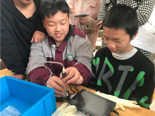 第三个环节是基于数字化实验的科学探究专题课,由工作室成员、beat365中文官方网站殷晓婕老师执教《空气中氧气含量测定的再探究》,精妙的教学设计,灵动的体验教学,让孩子们化解了一个个教学难点,激发了学生学习化学的兴趣,优化了学生学习化学的思维,彰显了科学探究教学的生命力,也激发了全体观摩教师的研究热情。这也是周岗学校的孩子们第一次用LabQuest设备做定量探究实验。