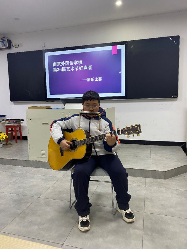 你瞧,这位同学是不是特别厉害?他正在同时演奏吉他和口琴,节奏把握的准,还乐感满满,看的老师也连连点头。