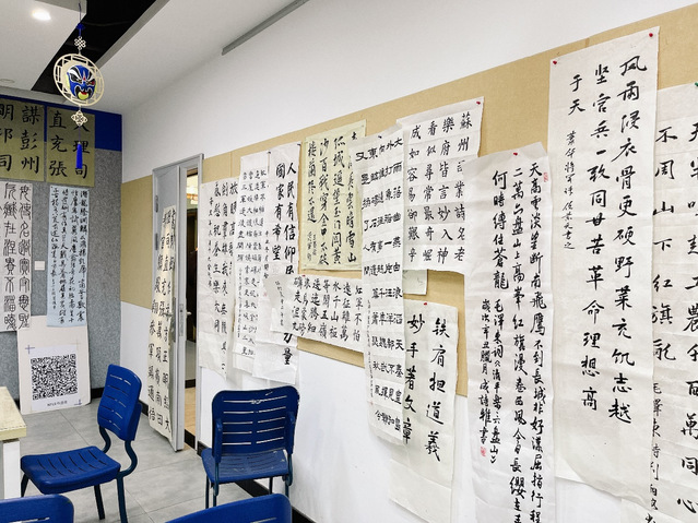 书写完成后,同学们将自己的作品钉在墙上,热切地相互分享、相互学习,交流书法的章法魅力,领略红色文化之光。