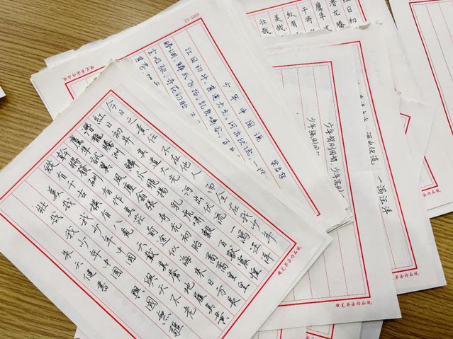 硬笔书法赛场,同学们书写的是梁启超的《少年中国说》。拿到稿纸,同学们便开始专心致志地书写,偌大的教室寂静无声。楷书端正秀美,行书行云流水,一笔一划间传达出“少年强则国强”的恢宏气魄。