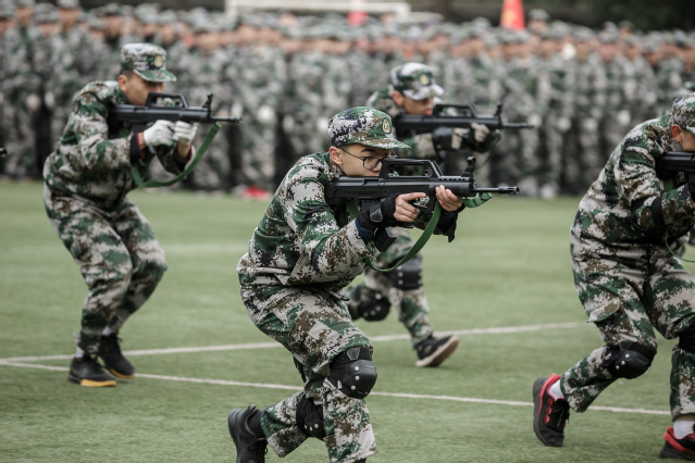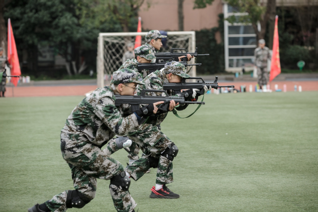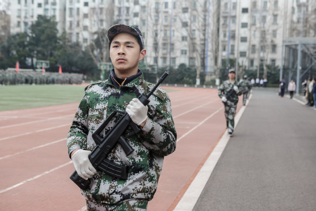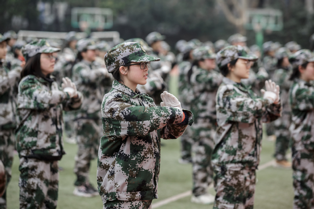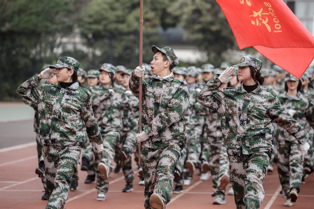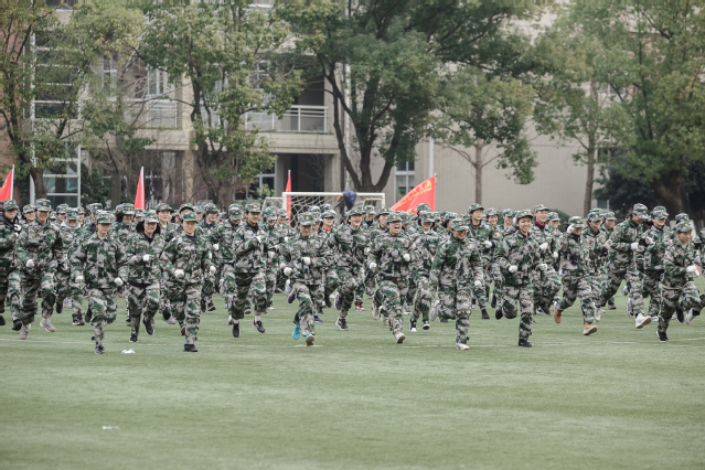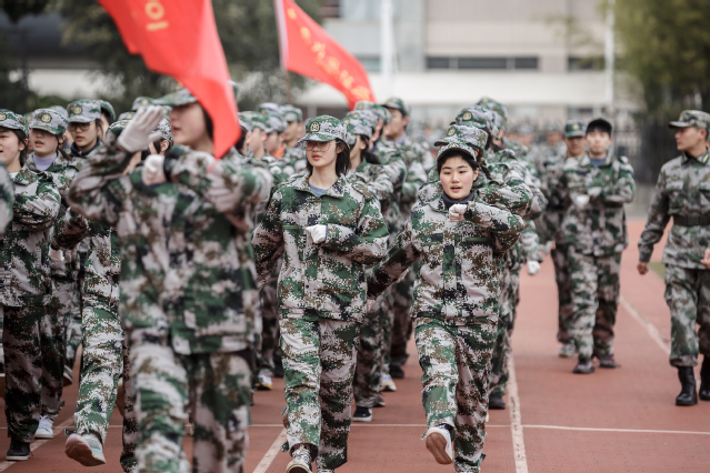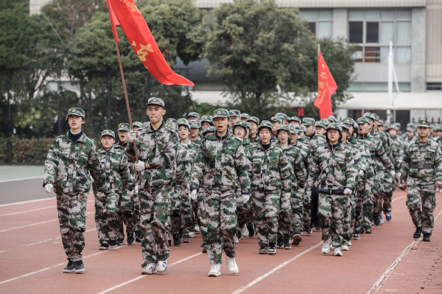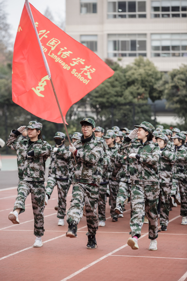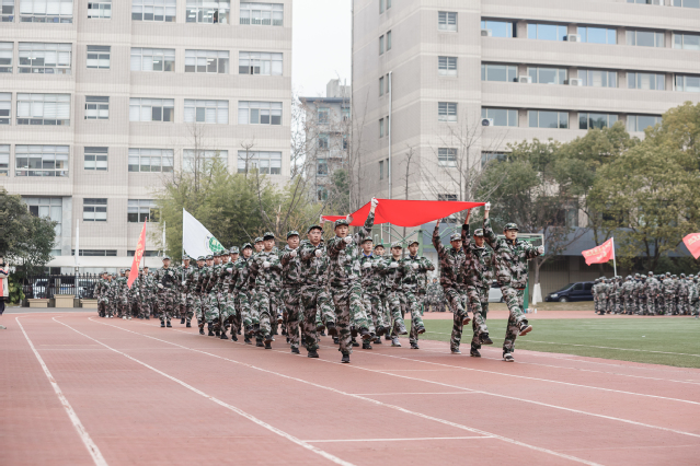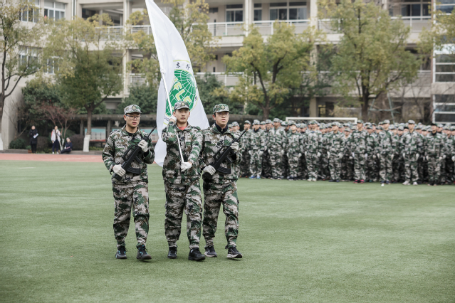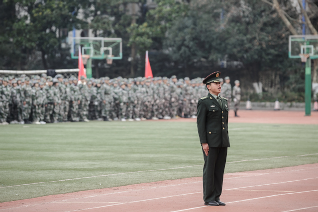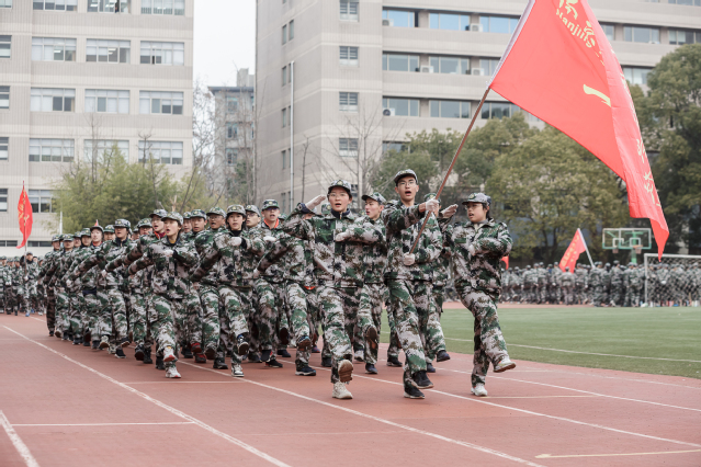 随着主教官铿锵有力的指令,校旗在军歌声中飘扬,标兵整齐有序地站定,有力的正步声在空中回响。刘书记在总教官陪同下,开始阅兵。“首长好”“为学校争光”的呐喊声连绵起伏。紧接着所有严阵以待的同学们随着各连长的一声令下,开始进行分列式汇报,整齐有力的步伐声,烙印于心的口令声,与响彻天际的口号声久久回荡在校园上空。