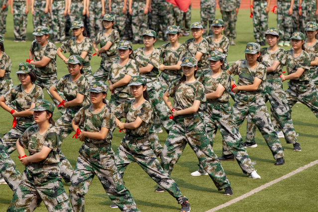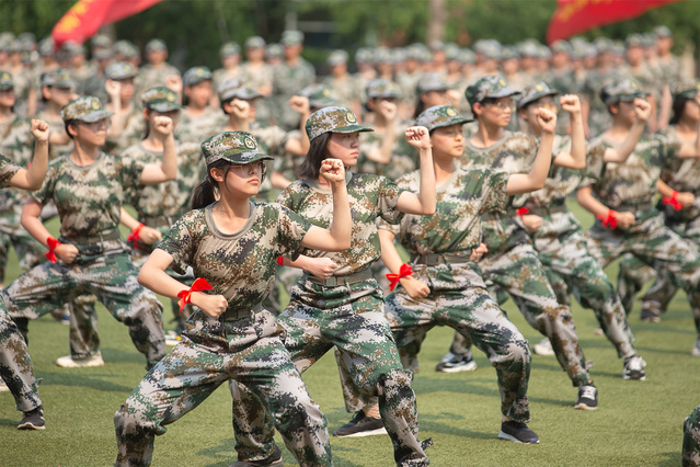 “一二一、一二一”、“拼搏青春、一往无前!”训练场上,响彻着各连队精神饱满的喊声。走直步时前面的手臂要成45度,后面的手臂要伸得尽量高,同学们按照教官的要求,精准控制着自己的摆臂动作;踢正步时整个连队要一起落脚,步调一致声音才会整齐,同学们练习了一遍又一遍,终于形成了默契,气宇轩昂,体会到了军人的感觉;喊口号时要有气势、有魄力,于是同学们学习用腹发力,把口号喊得声势浩大,显出排山倒海之势。“嘿、嘿哈嘿…哈、杀!”男女生军体拳的同学们轻如飞燕、猛如霹雷。出拳、劈掌、侧踢…一个个动作行云流水、刚劲有力。