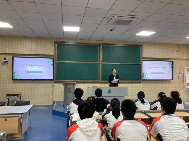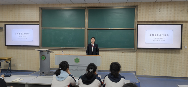 随后优秀辅导员代表陈思彤和崔又文同学分享了他们的工作经验。高三(1)班陈思彤同学指出,学生辅导员需要在学习、生活等方面基于同学们及时的引导和帮助,要与同学们多加沟通交流,了解他们的需求和问题,并有针对性地开展工作。此外,与班主任和搭档的沟通也尤为重要,与同学、老师们沟通交流也是学生辅导员应具备的一项重要技能。