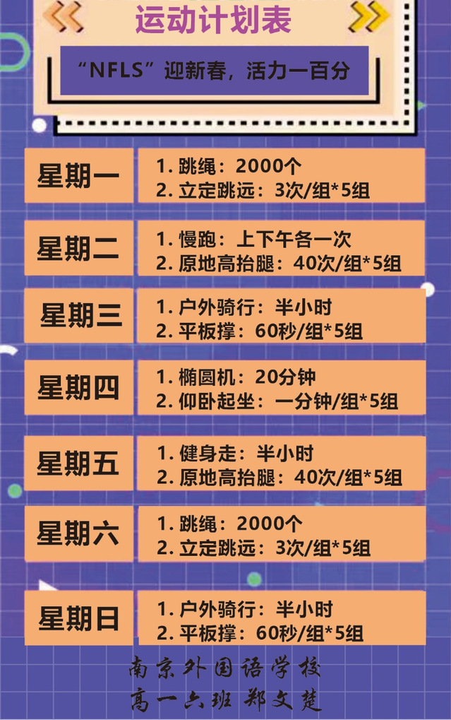 俗话说“冬练三九”,寒假是锻炼身体的好时机。当下,我们更要每天坚持体育锻炼,增强免疫,做好自我保护。高一年级同学积极开展每日的锻炼活动并提交一周的个性化锻炼计划。有的同学利用互联网资源,参考网上的健身视频跟练;有的同学和家人朋友一起去户外踏“冬”,在增强身体素质的同时欣赏特别的冬日风光;还有的同学在“阳康”之后选择较为平缓的运动,如慢走、做操等,度过了一个充满“健康味”的寒假。