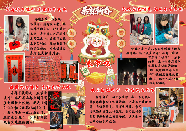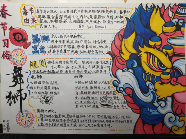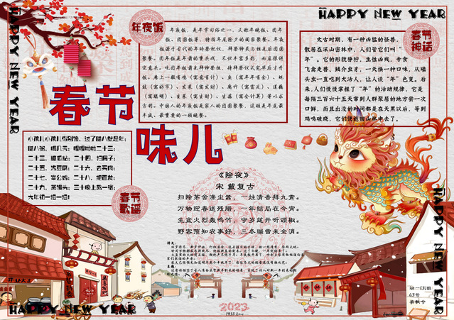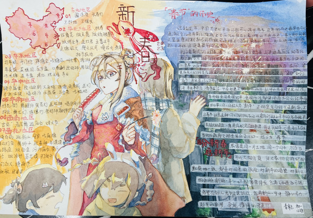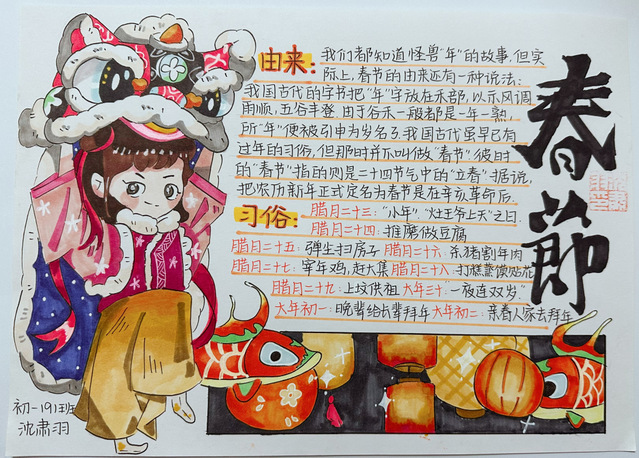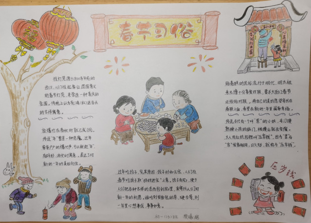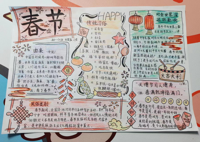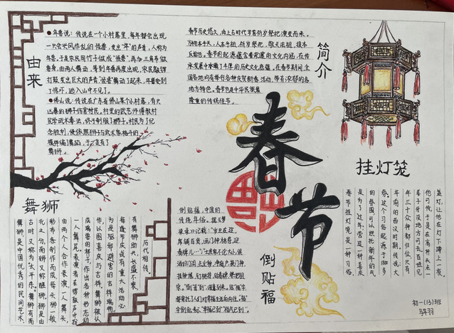 习近平总书记提出:“中华优秀传统文化是中华民族的精神命脉,是涵养社会主义核心价值观的重要源泉,也是我们在世界文化激荡中站稳脚跟的坚实根基。”春节是中华民族的传统节日,在全世界也有深远的影响。初一年级通过开展以“春节味”为主题的实践调查活动,运用“手抄报”的展现形式,进一步引导同学们了解春节的历史由来、春节的传统民俗、春节的对联诗词、春节的南北美食等方面,品味春节的魅力,体会传统节日的精髓,感受中华传统文化的地位和价值,增强同学们的文化自觉和文化自信,涵养同学们的家国情怀。