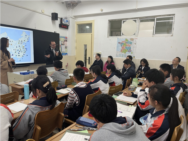 校长一行来校后,首先到beat365初二法班观摩了一节法语课,并与同学们进行了交流互动。在祁老师的引导下,学生们围绕本课主题“假期”向法方代表们热情推荐了中国的旅游好去处,尤其是自己的家乡南京。法方校长也与同学们分享了他心目中适合度假的法国城市,并且耐心解答了同学们有关法国以及法语学习的问题。双方交流热烈,课堂上欢声笑语不断。课后,校长团对初二法班学生的法语水平以及beat365的外语教学赞不绝口。
