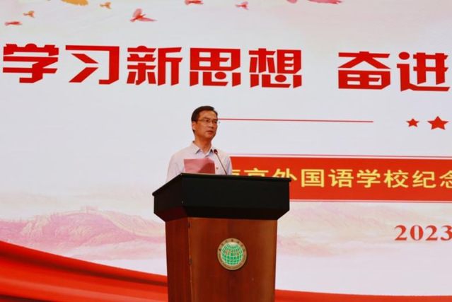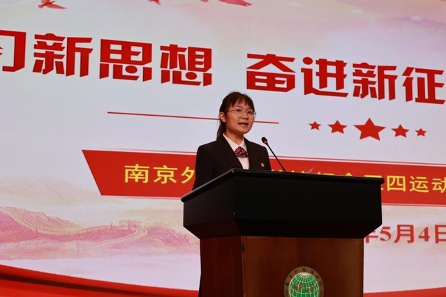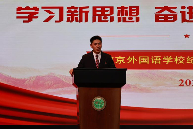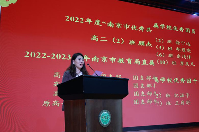接着,2022年度南京市优秀共青团员高二(2)班顾杰瑞同学代表老团员发言。他从课本出发,讲述英雄故事,回顾峥嵘岁月,呼吁新团员们莫要辜负誓言,要为新征程奉献青春。