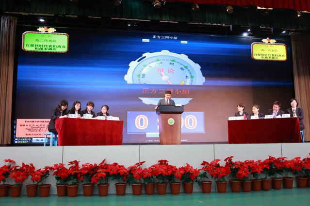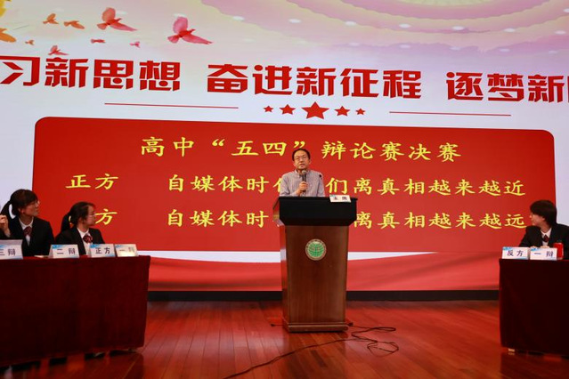 第二部分为高中“五四”辩论赛决赛。此次辩论赛意在引导同学们结合新时代的背景和特征,探讨自媒体时代,人们与真相的距离,以此激发大家的批判性精神,正确对待良莠不齐的信息。正方的观点是:自媒体时代我们离真相越来越近;反方的观点是:自媒体时代我们离真相越来越远。比赛的3位评委分别为南京大学新闻传播学院胡翼青教授、beat365中文官方网站南部新城综合管理办公室主任尹荷蓉老师、初一年级组长戴霞老师。正方四位辩手分别为高二(2)班刘若卉、高二(1)班邵舒婷、高二(7)班张佳宁、高二(4)班钟可涵,反方四位辩手分别为高一(6)班孟佳琪、高一(10)班姚亦辰、高一(10)班俞越、高一(4)班吉书瑶。通过激烈的思维碰撞和精彩的交锋质询,反方代表队在此次辩论中更胜一筹,正方张佳宁同学、反方姚亦辰同学凭借突出表现荣获“最佳辩手”称号。胡教授对辩论赛做了精彩点评,他肯定了同学们的精彩表现,也指出面对信息时代多样的媒体渠道,同学们要冷静思考,理性判断,对信息做到求真求实。