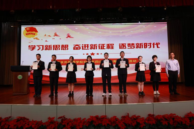 颁奖完毕后,新团员上台宣誓,老团员重温誓词,校团委书记王少林领誓。