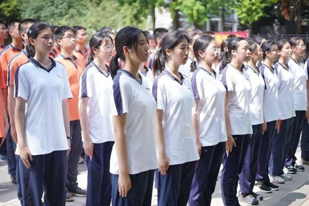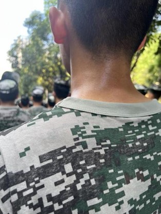 疾风般地出拳、扎实的马步、响亮整齐的口号、坚定落下的步伐,国旗班的训练现场洋溢着青春少年的意气风发。在高强度的训练下,汗水浸湿了同学们的衣服,他们满是汗水的后颈像镜子一样反射着太阳的光芒,但是同学们并没有退缩,反而更加显示出他们顽强不屈的品格,坚持训练。