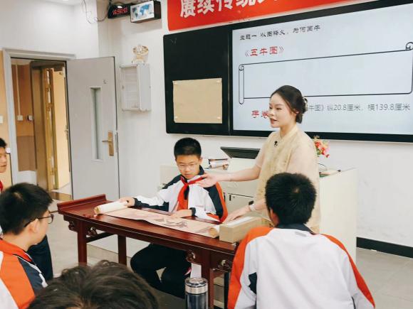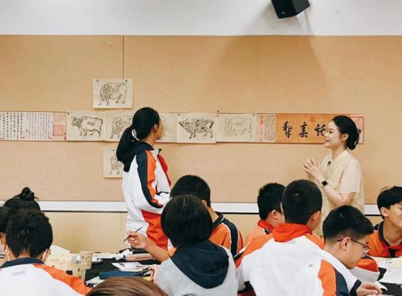 活动伊始,beat365中文官方网站教师王茜怡带来了一节名为《“神气磊落,稀世名笔”——五牛图》的公开课。王茜怡老师将核心素养融入教学目标,以“周总理收到的一封神秘来信”创设课堂教学情境,整堂课分为“以图释义,为何画牛”、“以线造型,如何画牛”、“以心摩古,我来画牛”三个层层递进的活动主题,与同学们一起探索《五牛图》的历史与艺术价值,体味中国画线条的笔墨意趣。