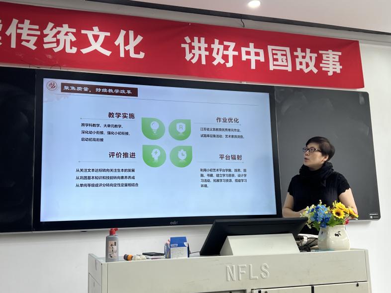 玄武区艺术教培员张艳丽老师针对本次教培活动做了精彩的点评,对于今天两位教师的表现给予了充分的肯定,并深入解读了“以美育人,以美化人,以美润心,以美培元”的深层含义,从以人为本、科研先导、聚焦质量、统筹协同这四个方面分解剖析,并鼓励全体教师在关注文本解读深度、表达精度和思维广度的基础上,不断探索,持续精进。