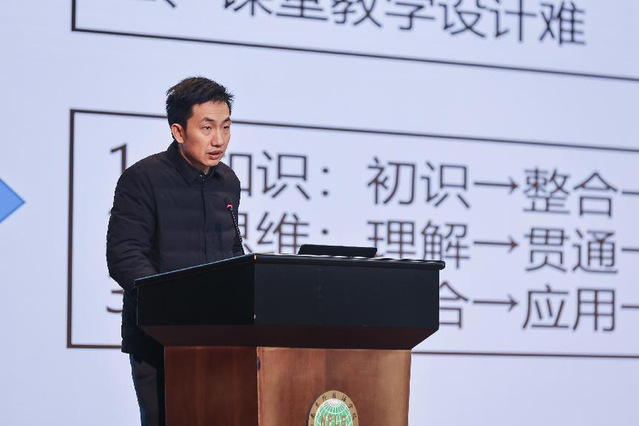 刘辉老师以《初中数学复习课教学的实践与思考》为题,分享了初中数学组校本课题研究中的问题与思考。他和团队中的老师们敏锐发现初中数学日常教学过程中存在的问题,集中教研组的力量和智慧设计基本框架,不断打磨板书设计,精心设置期中期末复习课专题学习单,通力研究解决教学中的问题。他们通过课题、公开课、研讨会等多种形式优化教学成果,实现教学推动科研,让科研服务于教学。
