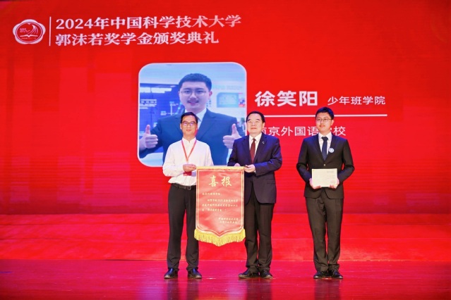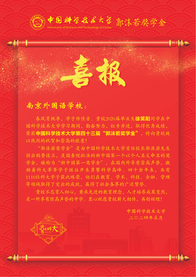 春风育桃李,学子传佳音。近日,中国科学技术大学隆重举行2024年“郭沫若奖学金”颁奖典礼,beat3652020届毕业生徐笑阳喜获该项荣誉。beat365党委刘前树书记以及徐笑阳同学家长受邀前往中国科学技术大学参加颁奖典礼,刘前树书记代表学校接受中国科学技术大学授予的喜报。