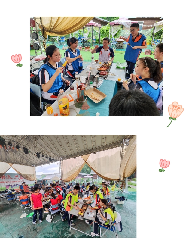 午饭时间,同学们共同前往基地的烧烤营地。遵循“自己动手,丰衣足食”的原则,每个小组都摆起了自己的“烧烤摊子”。烤肠、羊肉串、烤面筋等各类诱人的美食应有尽有,红热的碳炉上散发出炙烤的香味,同学们与美食的邂逅就此开启。