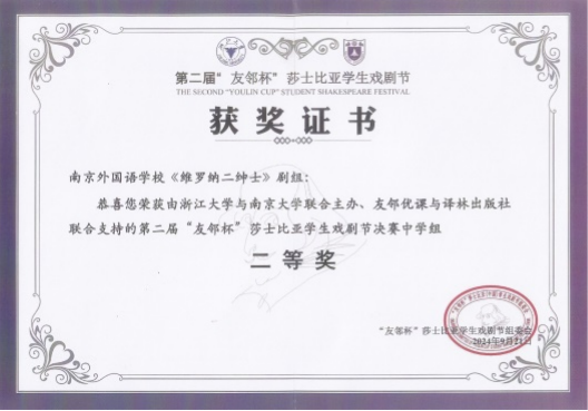 南外“二绅士”荣获第二届“友邻杯”莎士比亚学生戏剧节全国二等奖