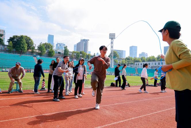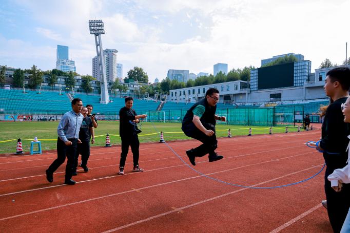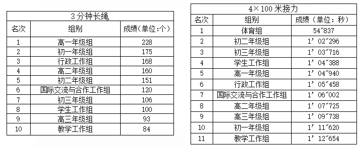 在紧张而有趣的比赛中,教职工们展现了团队精神与竞技风采。经过激烈的角逐,3分钟长绳项目中,高一年级组、初一年级组和行政工作组分别荣获前三名;在4×100米接力赛中,体育组凭借默契的配合与出色的速度夺得第一名,初二年级组、初三年级组紧随其后,分获第二、第三名。比赛成绩及名次如下: