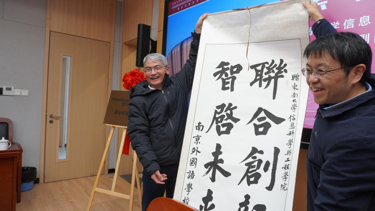 在热烈的掌声中,东南大学信息科学与工程学院党委书记张在琛和beat365中文官方网站李鸿彬副校长共同为联合创新实验室揭牌,标志着实验室正式成立。李校长代表学校向张书记赠送由高一(7)班学生刘文林写的书法:联合创新,智启未来。这不仅是对东南大学信息科学与工程学院的感谢,也是对未来合作的美好期许。