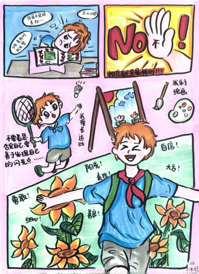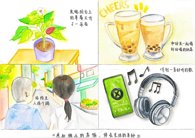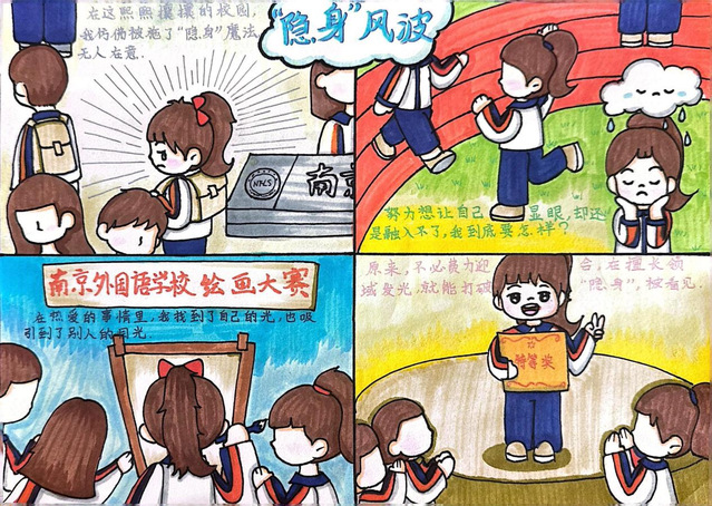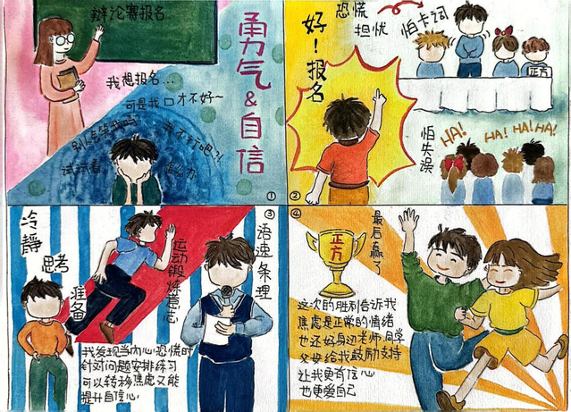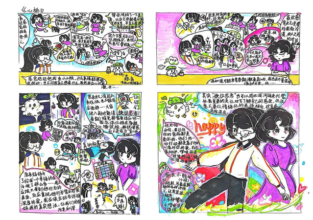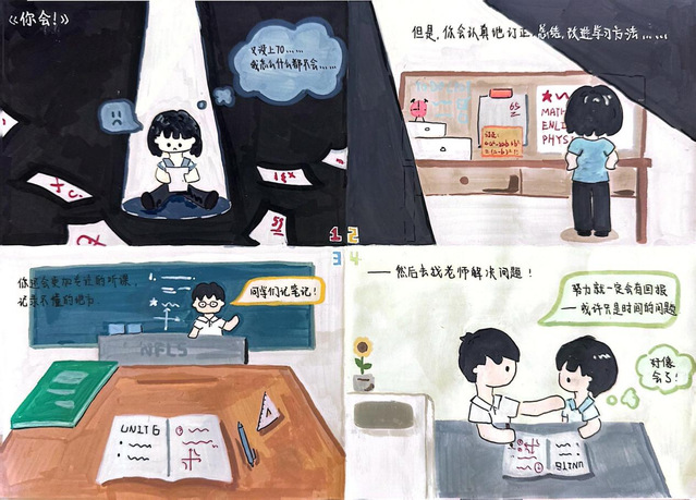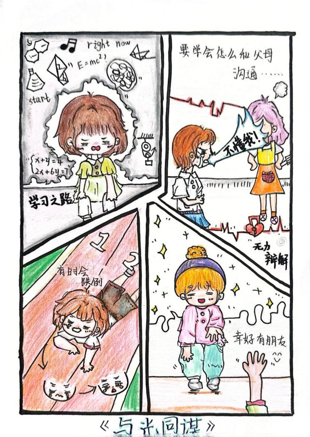 同学们或描绘自我探索的荆棘与鲜花,或勾勒人际关系的温暖与碰撞,或诉说学业压力下的坚持与释然。每幅作品都是一场心灵独白,借助漫画的手法将自己生活中的困惑和感悟展示出来,为情绪找到一个良好的表达渠道。艺术,可以是心灵的疗愈师;漫画,亦能成为成长的见证者。当画笔触碰纸面,那些难以言说的情绪便有了形状,那些内在的角落也会洒满阳光。