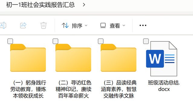 B.分类汇总参与同学的个人社会实践成果,放在对应的文件夹中。文件命名为新班级+姓名+作品(如:初一1班张小明劳动感悟)