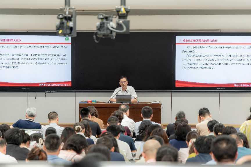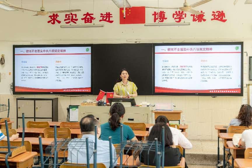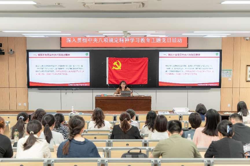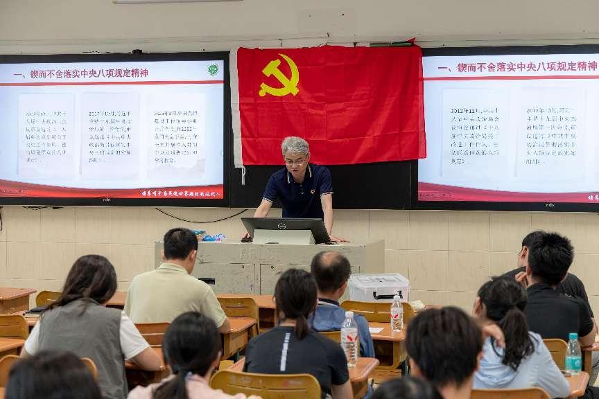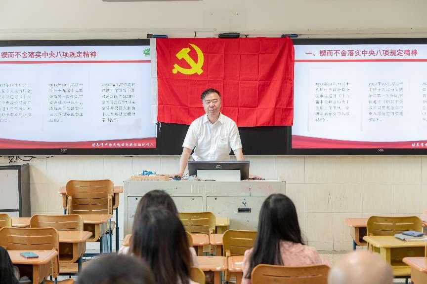 校党委书记刘前树同志面向全校党员讲授题为《弘扬教育家精神 做新时代大先生》的专题党课,深入阐释了开展学习教育的时代背景和重大意义。中央八项规定精神是全面从严治党的重要抓手,关乎党在人民群众心中的形象,关乎党的事业兴衰成败。对于学校而言,深入贯彻这一精神,是营造风清气正校园政治生态、推动学校教育事业高质量发展的必然要求。只有严守纪律红线,才能确保教育资源得到合理利用,教育教学工作得以公正、公平开展,为学生成长成才创造良好环境。全体党员应扎实践行学习教育的各项要求。一方面,应深刻领会中央八项规定精神的内涵与实质,加强自我约束,从自身做起,从小事做起,坚决杜绝违规收受礼品礼金、违规吃喝等行为,以清正廉洁的作风为广大师生树立榜样。另一方面,应在教育教学工作中积极践行教育家精神。秉持“启智润心、因材施教”的育人理念,尊重学生个性差异,激发学习潜能,助力每位学子成长;怀揣“乐教爱生、甘于奉献”的仁爱之心,以赤诚之心陪伴学生,做好人生路上的引路人;坚守“心有大我、至诚报国”的理想信念,将个人追求融入国家教育事业,恪守师德、廉洁从教,自觉抵制不正之风,以实际行动践行对党和人民教育事业的忠诚,始终在思想上、政治上、行动上与中央八项规定精神保持高度一致。