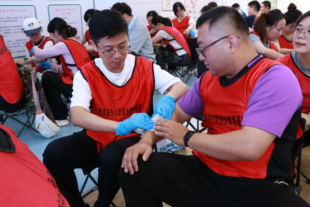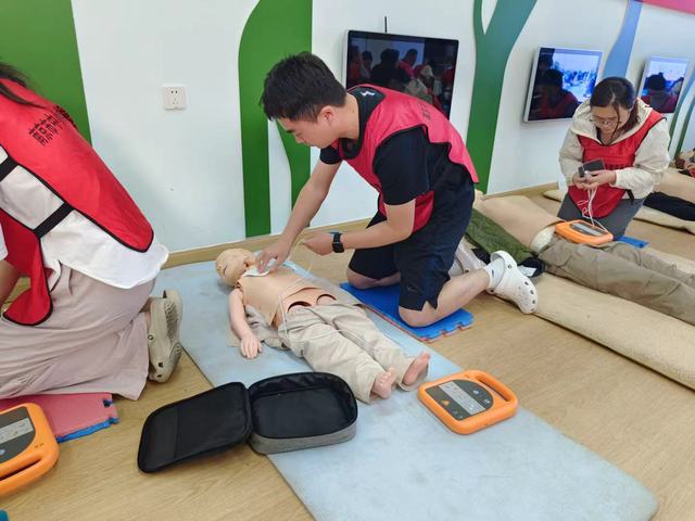 医疗急救课堂上,专业医护人员带来的“干货”让大家直呼实用。从学生常见的擦伤、扭伤处理,到足以救命的止血包扎、AED除颤操作,每一个步骤几乎都要求“零误差”。在模拟人体模型前,老师们反复练习心肺复苏,额头上渗出的汗珠见证着他们的专注。