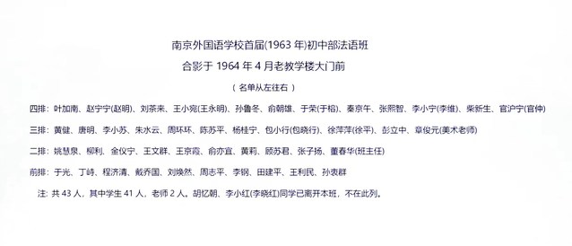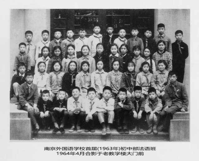 南外首届(1963年)初中部法语班1964年4月合影于老教学楼大门前